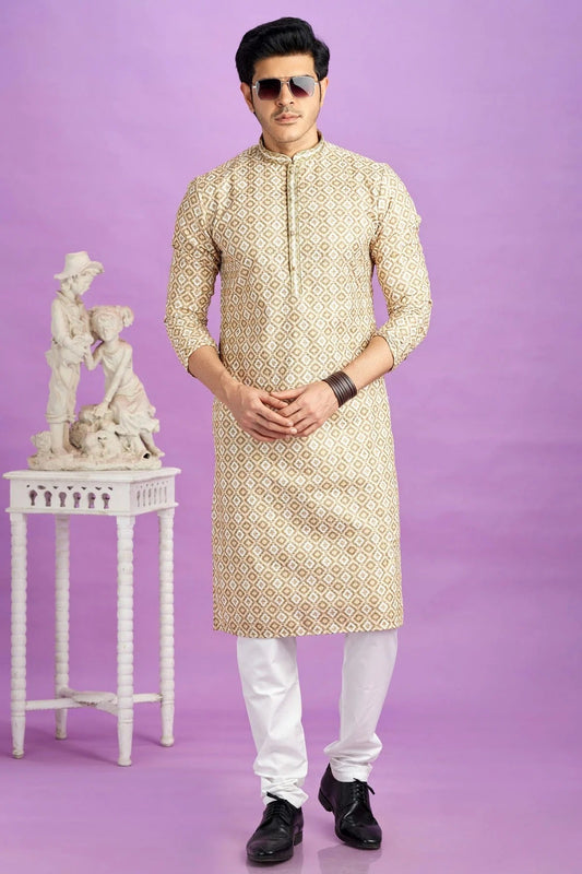 Cream Colour Jacquard Art Silk Pintex Work Kurta Pajama KP1230204