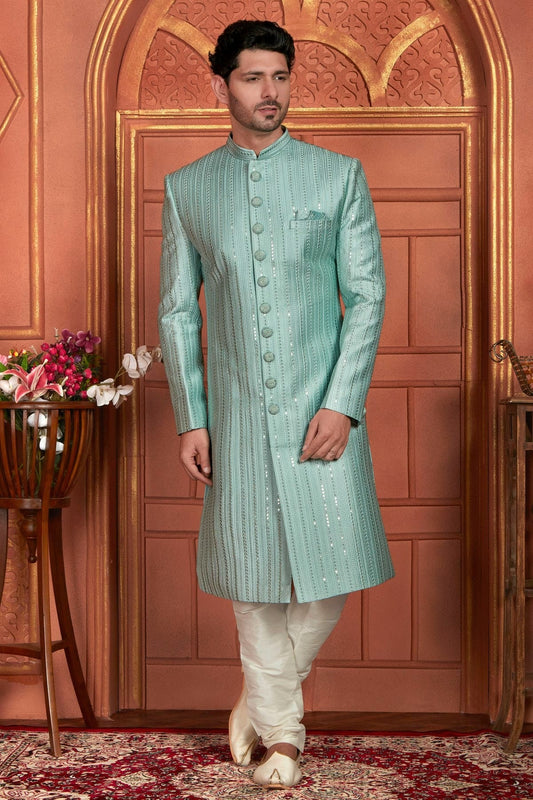 Light Blue Colour Art Silk Sherwani With Churidar Pant SH1230050