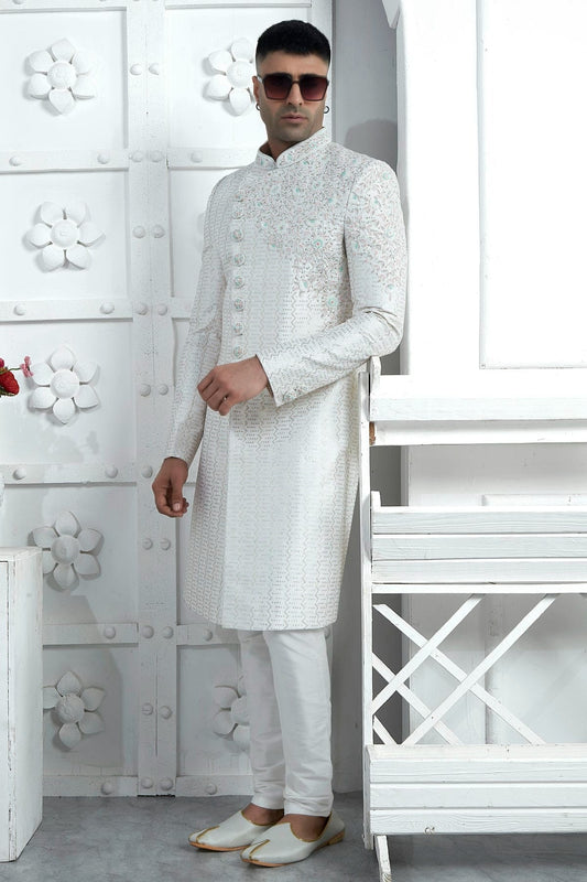 Off White Colour Georgette Sherwani With Churidar Pant SH1230074