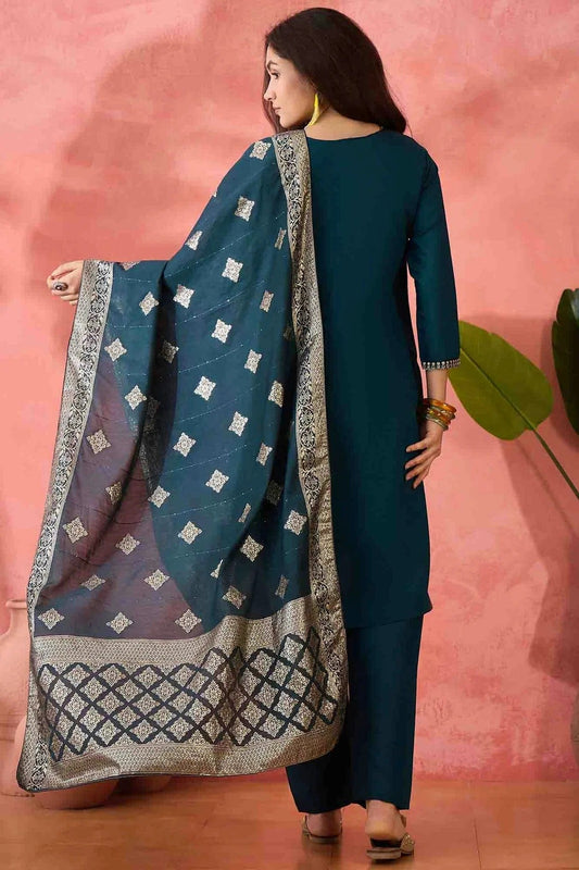Teal Colour Embroidery Viscose Silk Pant Style Suit SS1113489