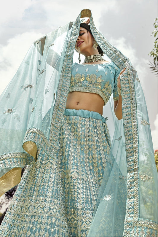 Turquoise and Blue Colour Organza Embroidery Bridal Lehenga Choli LC1080299